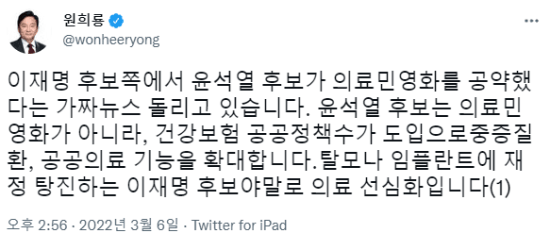 제20대 대통령으로 국민의힘 윤석열 후보가 당선된 이후 sns 상에서 윤석열 정부가 의료민영화를 추진해 의료비가 상승할 것이라는 주장이 퍼지자, . 한편, 윤석열 당선인이 실제로 내건 . 윤석열 당선에 '의료민영화·최저임금 폐지'?…국민의힘 가짜뉴스, 군부대 대 휴대전화 사용도 금지 추진? 국민의힘 윤석열 후보가 대통령으로 당선되자 최저임금 제도가 폐지되고 의료 민영화가 이루어진다는 등의 이야기가 급속도로 퍼졌다. 이어 오히려 민간의료기관도 필수적인 공공의료기능을 더 담당하도록 건강보험 공공정책 .